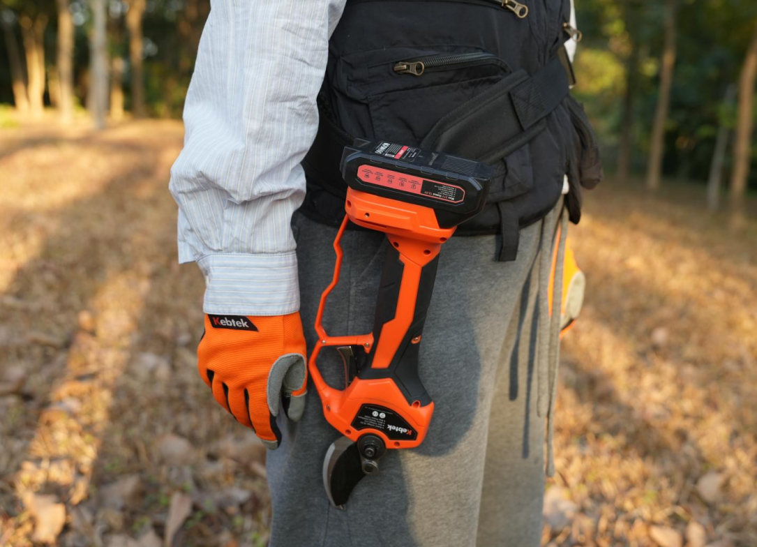 3.【Built in Safety Switch】The electric tree pruner have a safety switch to prevent accidental activation. Press the power button, you need to press the switch twice quickly before use. The power pruner will enters “standby” mode and stop working if 3mins without pruning. And it will enter "auto turn off" mode after 15mins when not in sue. Then you need to restart it if you want to prune again. This can also be referred to as an energy saving mode that maximizes battery life.