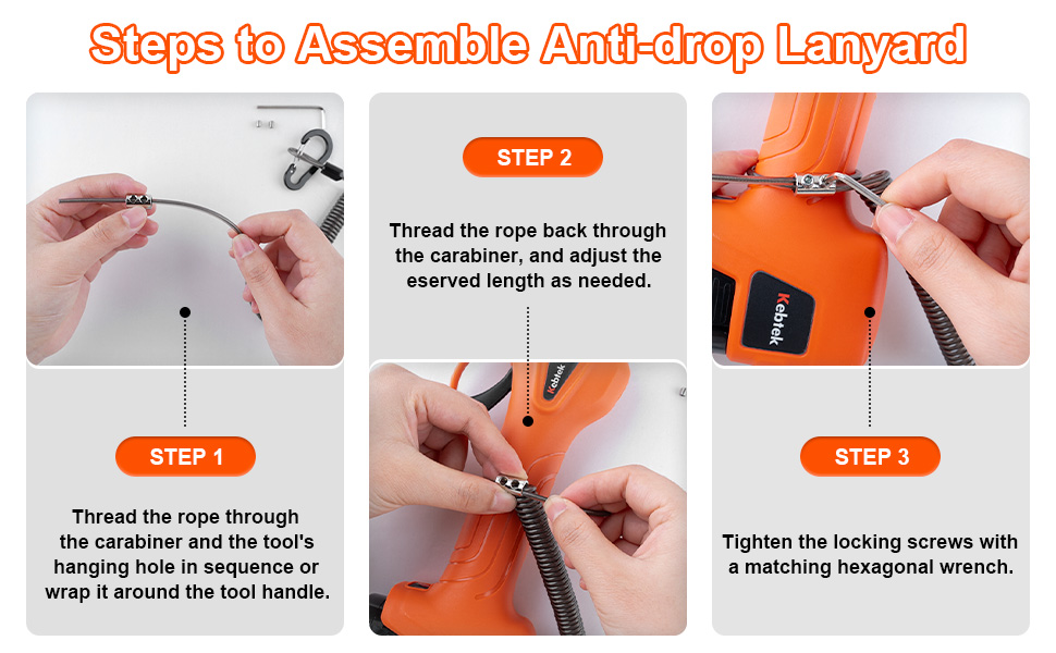 1.Thread the rope through the carabiner and the tool's hanging hole in sequence or wrap it around the tool handle.